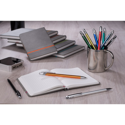 • Cienki i zgrabny metalowy długopis w kolorze o metalicznym wykończeniu. Klip i końcówki w kolorze srebrnym chromowanym. AVALO wyróżnia się wśród podobnych długopisów oryginalnym projektem klipu. Korpus ozdobiony został dwoma skośnymi paskami w kolorze srebrnym. Wkład o grubości 0,7 mm w kolorze niebieskim.